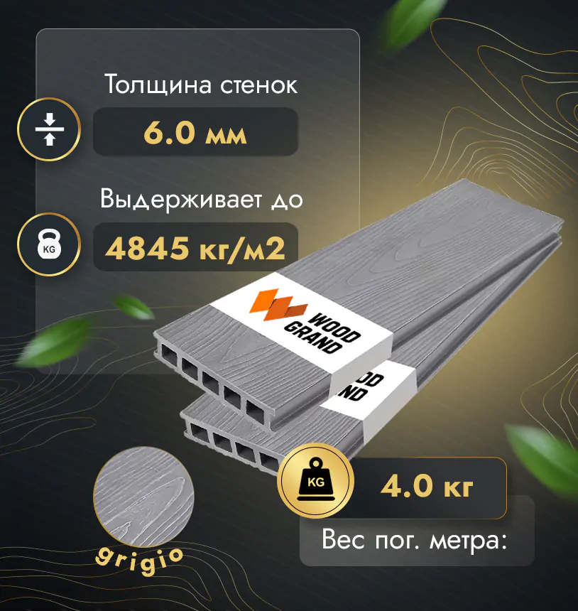 Наша террасная доска из МПК выдерживает до 3318 кг/м2, влагостойкая, не требует ухода.
